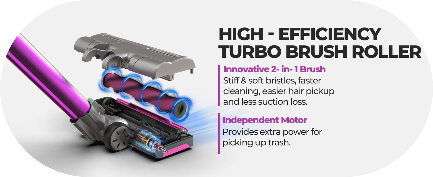- ✅Multi-Surface Roller - our R3 cordless stick vacuum is equiped with an upgraded roller that consists of two fabric brush strips and a rubber strip, ensuring high level of cleaning efficiency on both floor and carpet.
