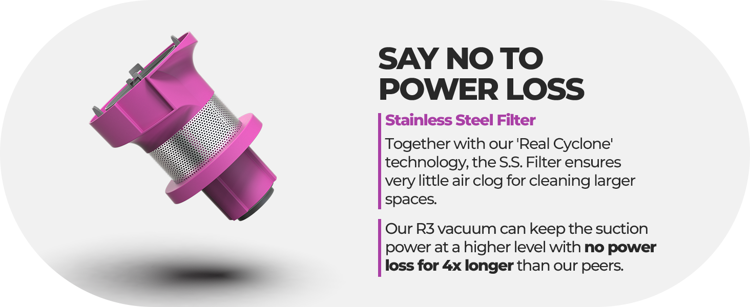 - ✅Fadeless Suction Power - our R3 cordless stick vacuum cleaner has an advanced airflow design and is tested to mait high suction power for 40% longer.