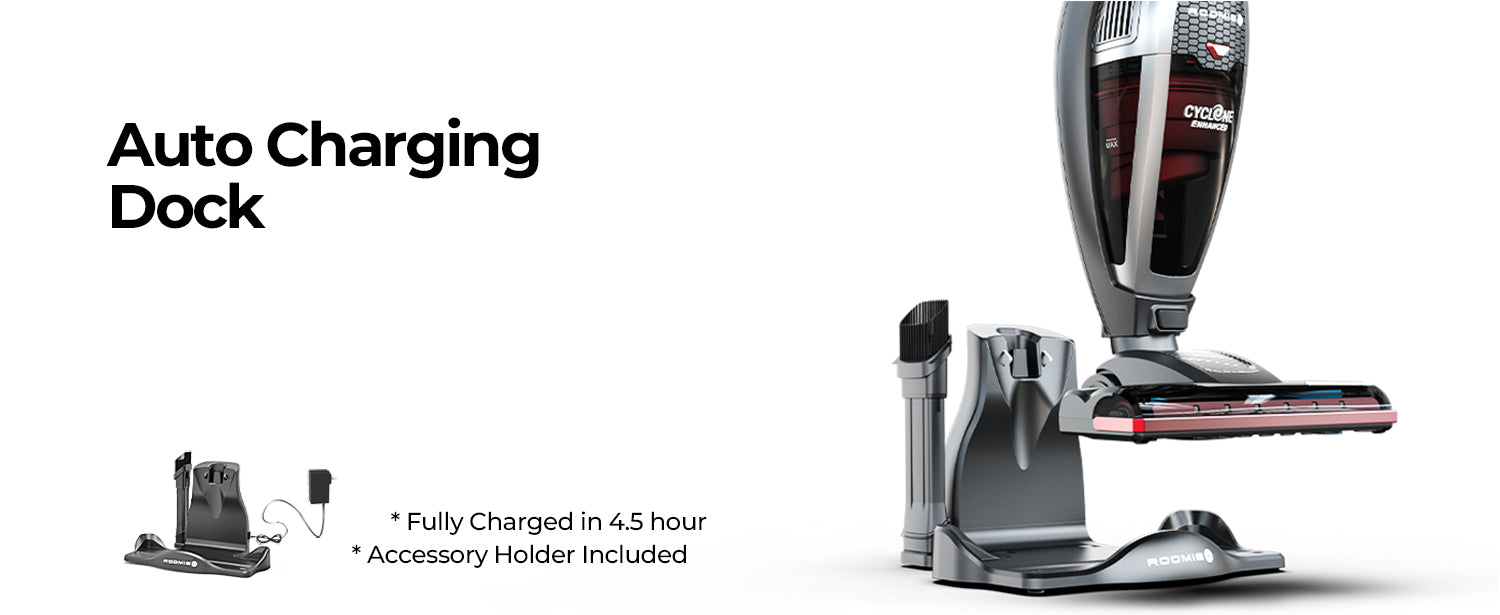 - ✅ Auto Charging Dock - Simply rest our cordless vacuum cleaner on the base for storage and auto recharging. No need to find the plug anymore. Power shuts off automatically when fully recharged.